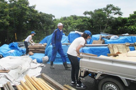 作業の様子です。トラックに建築端材のべニアを運んで下ろしてもらっています。