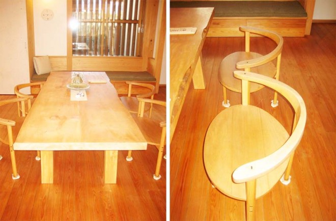 テーブルと座卓、天板は大きな2枚板です。「栃の木」でしょうか。無垢材は何とも言えない味わいがありますね(^^)